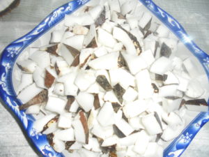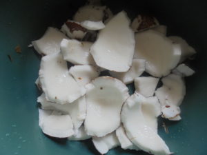 Pour 2.5 litres de lait, j’ai utilisé 03 noix de coco et un litre d’eau.