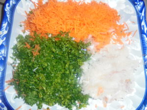 • Peler, laver et râper la carotte, l’oignon et l’ail