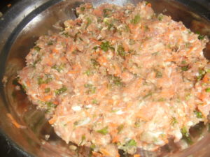• Verser la viande dans un saladier et y ajouter le persil, les carottes, oignon, ail, poivre et sel. Casser et y ajouter l’œuf. Bien mélanger l’ensemble