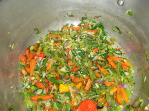 - Ensuite ajouter les oignons, ail, haricots verts et poivrons hachés et frire encore pendant 02 min avant d’y ajouter les condiments, la tomate et le pigment;
