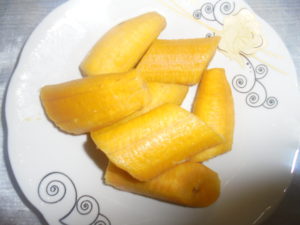 - Poser une autre marmite sur le feu et y introduire 250 ml d’eau, laissé l’eau bouillir avant d’y ajouter les plantains. Temps de cuisson des plantains 15min.